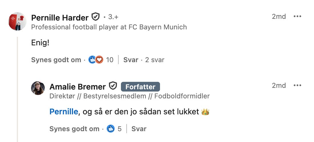 Men når både KVINFO’s direktør Henriette Laursen og Danmarks største kvindelige landsholdsspiller Pernille Harder hylder Bremers pest-i-hjernen opslag, så må sådan en fodboldmæssig nobody som mig jo give det et skud.